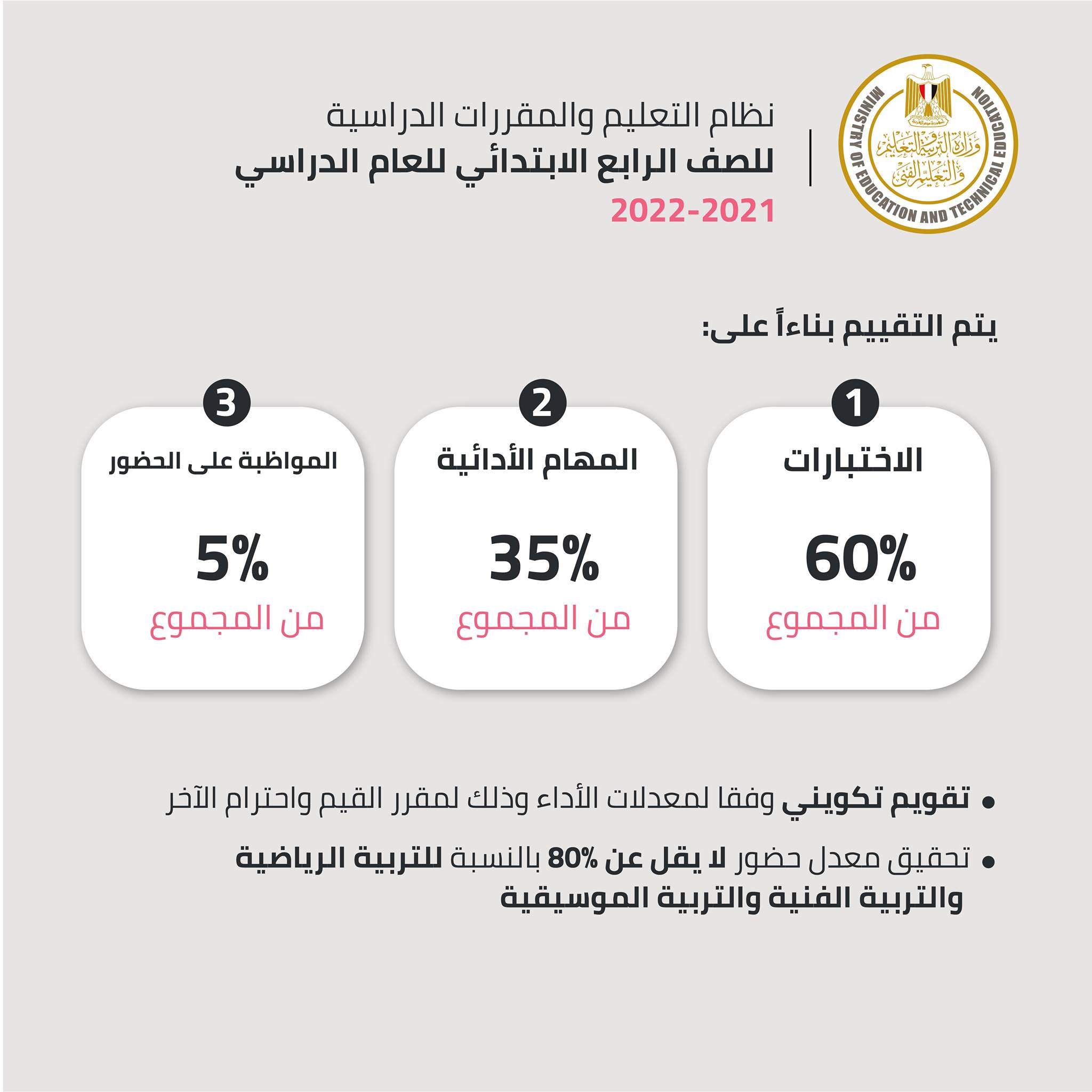 بشأن نظام التعليم والمقررات الدراسية للصف الرابع من الابتدائي للعام الدراسي ٢٠٢١-٢٠٢٢، قررت #وزارة_التربية_والتعليم والتعليم الفني تطبيق المناهج الدراسية على تلاميذ الصف الرابع الابتدائي بكافة مدارس التعليم العام : ( الرسمية – الرسمية للغات – الرسمية المتميزة للغات – الخاصة بنوعيها العربي ، واللغات ).